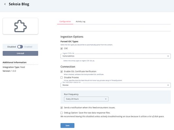 This feed periodically pulls blog posts from the Sekoia website, and ingests them into ThreatQ as report objects.