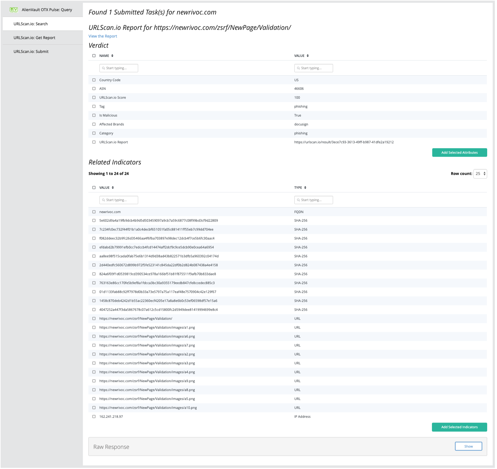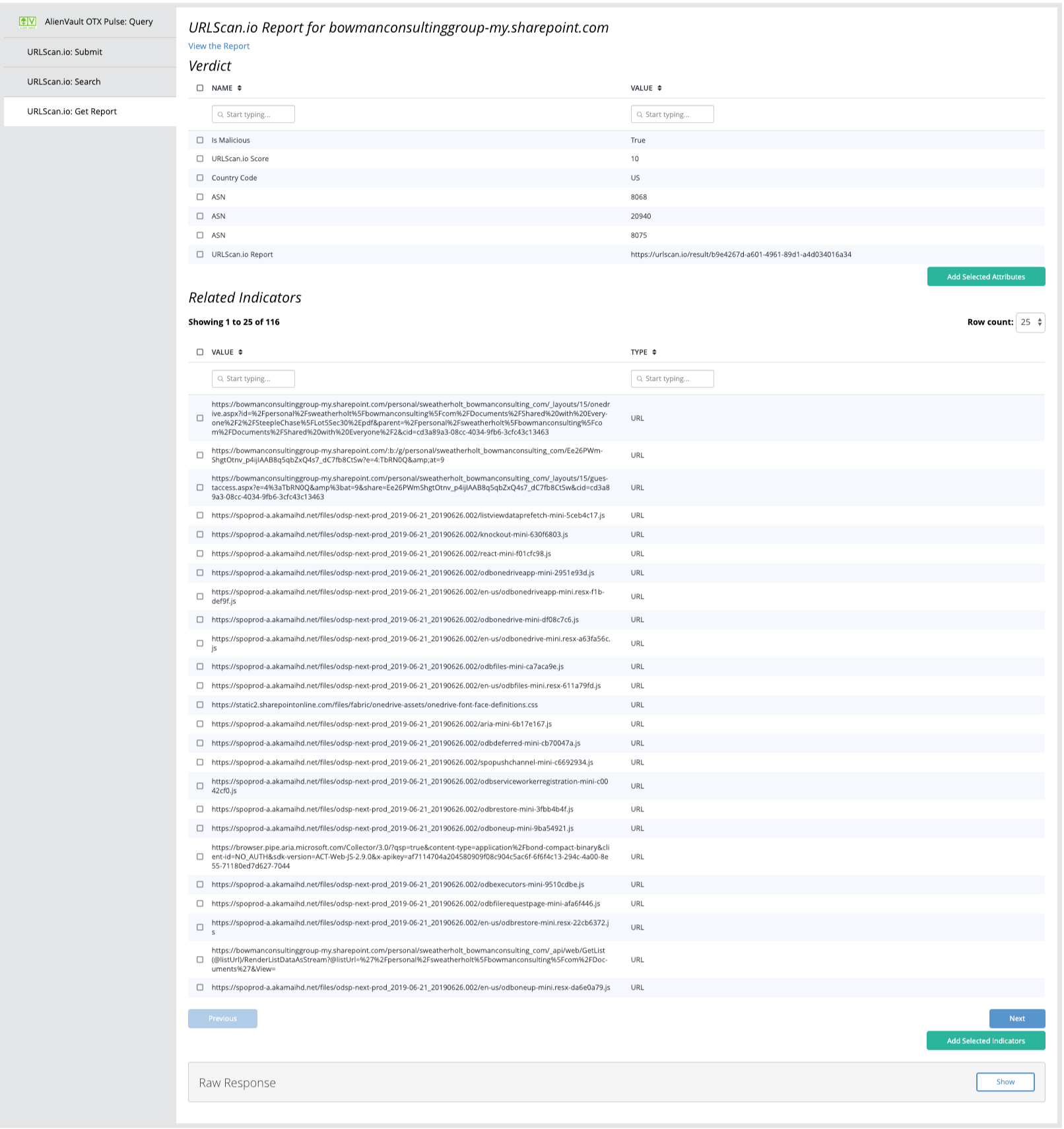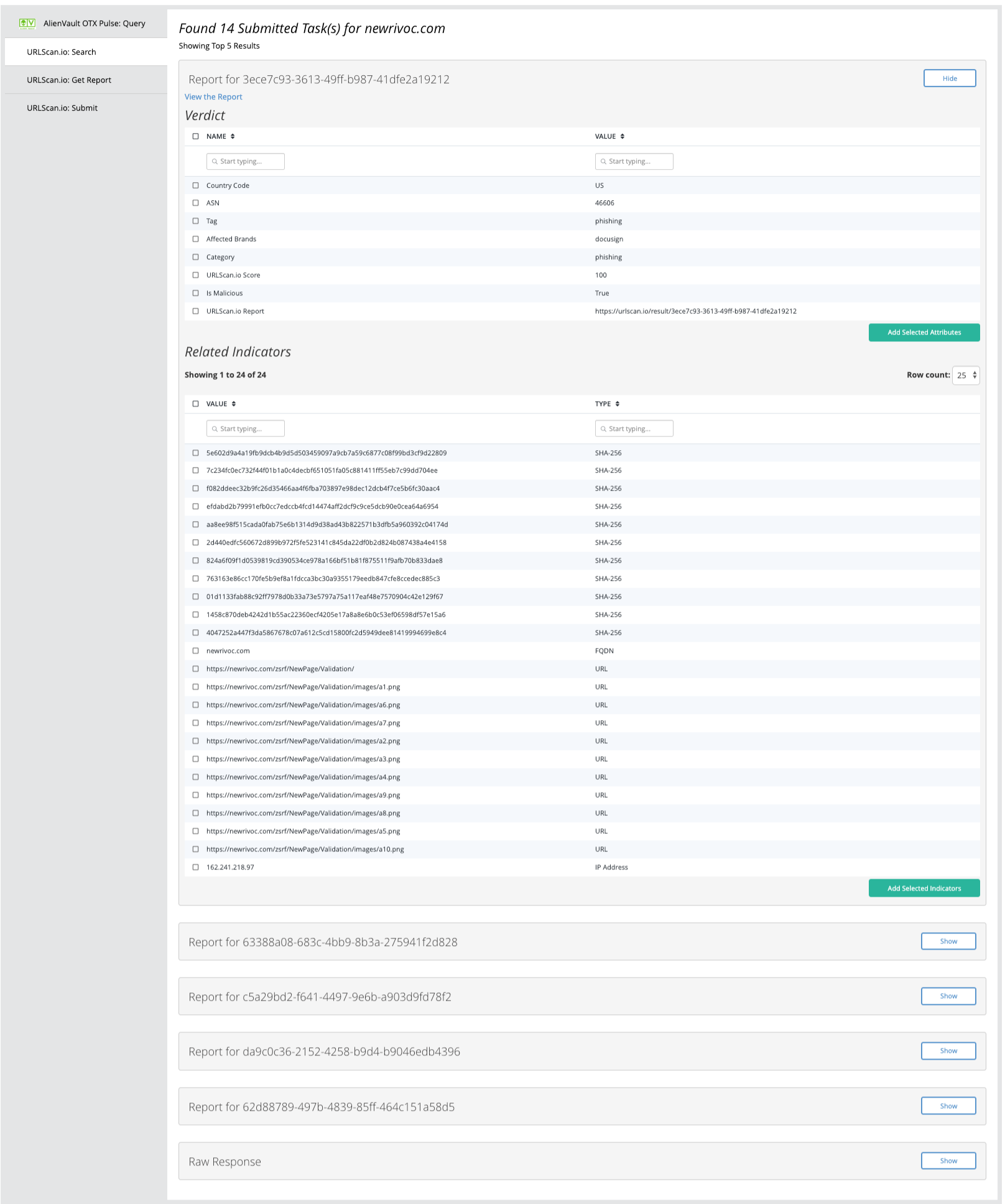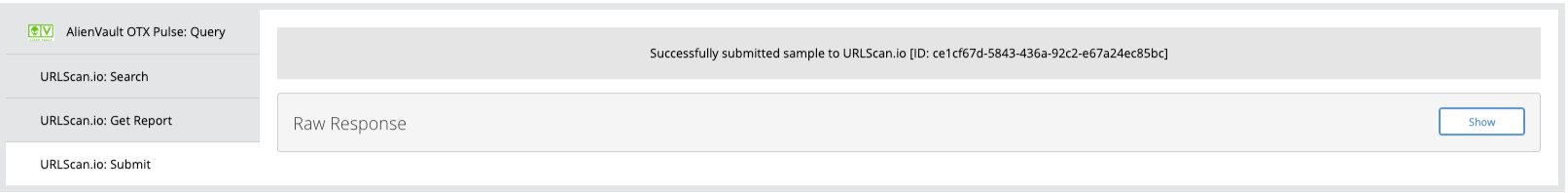 - Submit - submits a URL or FQDN to URLScan.io. Once submitted, an attribute called "URLScan.io ID" will be added to the indicator.